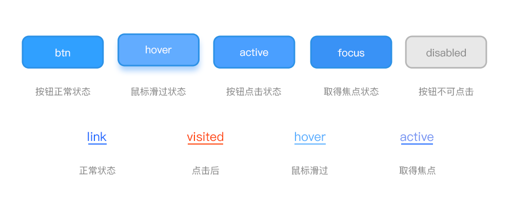 同樣的鏈接樣式也可以應用在圖片、按鈕、表單之上。點擊、鼠標懸停、鼠標按下都可以設計成不同的樣式,方便用戶通過鼠標感知這個物體是被我按下去的,這種給用戶的暗示我們也叫做點擊感。當然按鈕會和鏈接稍有不同,按鈕除了具備
